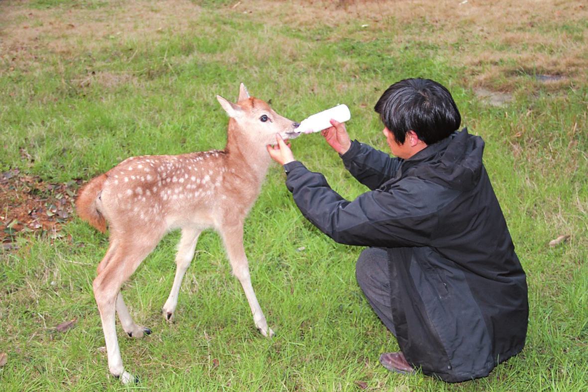 ◀杨晓强用奶瓶喂小鹿“点点”